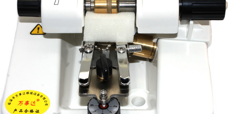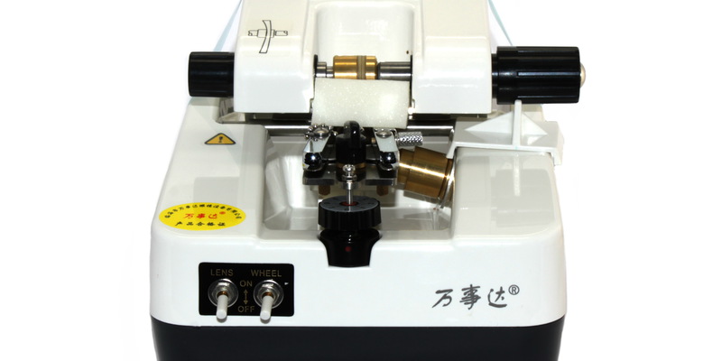 Станок для нарезания паза под леску может вырезать паз линзы, имеющей любую форму и имеет регулировку угла наклона в соответствии с кривизной линзы с возможностью его блокировки.